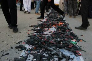 جمعنا أكثر من ألفي قطعة لعب على شكل أسلحة، وأخترنا مركز المدينة القديمة مكانا لأقامة الحدث وبحضور رئيس مجلس المحافظة وأعضاء من المجلس و سياسيين ومثقفين وجمهور واسع بهدف أساس هو تشكيل لوبي أجتماعي للضغط على أصحاب القرار لمنع التجارة بهذه الألعاب والحد من أنتشارها لحماية الأطفال منها، حيث وضعت الألعاب على الأرض وقامت آلة حدل بسحق الألعاب وتكسيرها كخطوة رمزية، وشغل الآلية طفلين هما آية وعمر، ثم تم توزيع الورود على الحاضرين جميعا.