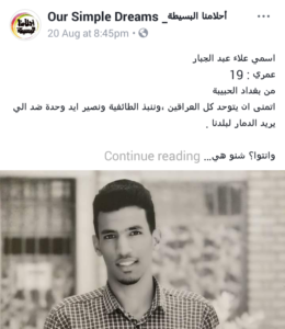احلامنا البسيطة كان نتاج حديث عفوي مع مجموعة شباب من مختلف المحافظات العراقية ، لاحظنا ان احلامنا بسيطة ومشابهة كبقية الشباب العراقيين, على اختلاف خلفياتهم الدينية و المذهبية و القومية. الصفحة كانت وسيلة لتذكر الشباب بالمشتركات بينهم وانهم في الواقع اوجه مختلفة لنفس العملة.فقمنا بتقديم اقتراح من خلال الصفحة بارسال حلمك مهما كنت تراه بسيط وتأمل بتحقيقه ولاقت نجاح جيد و اقبال واسع من الشباب التي كانت معظم احلامهم العيش بسلام وتجاوز الاختلافات , الحصول على فرصة عمل حكومية , الوقوع بالحب , لاعب كرة قدم…الخ هذه بعض من الكثير من الاحلام التي وصلت للصفحة , نحن نتشابه من الداخل أكثر مما نتصور ,والاجمل هو الدعم والمحبة التي قدمها جمهور الصفحة لكل شاب قام بارسال حلمه غير اّبهين بمسقط رأسه او معتقده او شكله , وهذا كان واحد من لاهداف التي أملنا بتحقيقها من خلال هذه الصفحة .