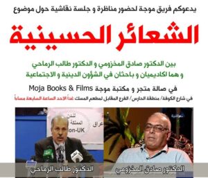 اقيمت في مركز موجة في 18 اوكتوبر 2015 مناظرة حول قضية الشعائر الحسينية بين الدكتور صادق المخزومي الاكاديمي و الباحث في الشؤون الدينية و الكتور طالب الرماحي رئيس مركز العراق الجديد للاعلام و ادار المناظرة عضو الفريق صلاح عبد المهدي