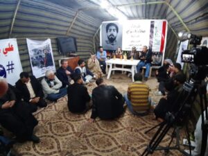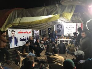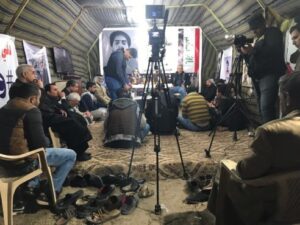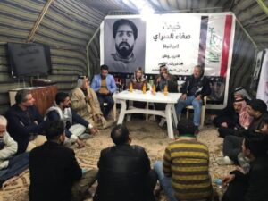 جلسة حوارية في ساحة تظاهرات النجف في خيمة صفاء السراي حول تأثير التظاهرات على الفجوات بين الاجيال و الصراع بين جيلين من الاباء و الابناء.